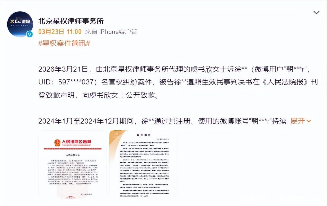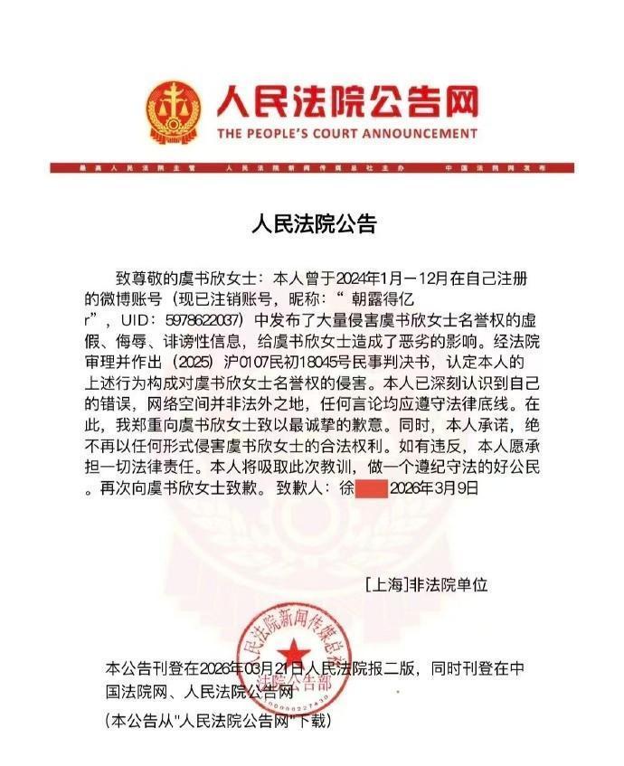 虞书欣胜诉的消息在3月21日尘埃落定,律所那边刚把喜讯放出来,心里那块大石头总算能落地了。整整两年的拉锯战啊,那个姓徐的网友当初在网上疯狂输出恶意谣言,以为注销账号就能玩“人间蒸发”,这算盘打得也太响了吧?结果呢,天网恢恢疏而不漏,该来的惩罚一个没少。这次判决挺有分量,不仅要在报纸上公开登报道歉,还得赔偿三万块。钱数看着不算巨款,但这可是实打实的“打脸”,给那些想搞事情的人提了个醒:网络不是法外之地,别以为躲进虚拟世界就能为所欲为,做了亏心事迟早得现原形。